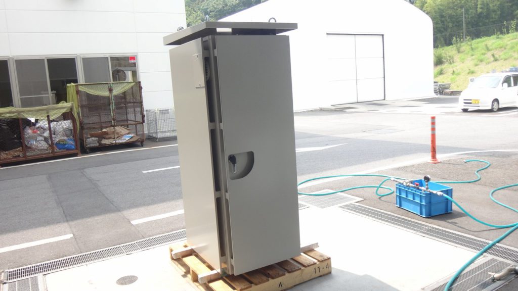 この写真の製品は屋外型の自立筐体です。この筐体は防水性を高めるために、ビス組構造(板金フレーム構造の骨組みに4方からパネルをビスで止める構造)とシリコンコーキングを施しています。その結果、防水保護等級はIP44相当となっており、屋外での機器を収容させる筐体に適しています。(IP44相当の試験はマエショウの社内の防水試験にて実施済です)