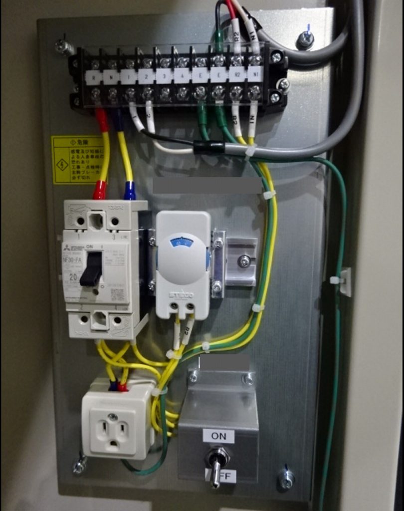 弊社では熱対策として温度スイッチ、排気ファンを取り付け一定以上の温度に上昇すると排気ファンが動作し、筐体内の温まった空気を屋外へと排出し、吸気口から屋外の空気を取り込み冷却する仕組みになっています。