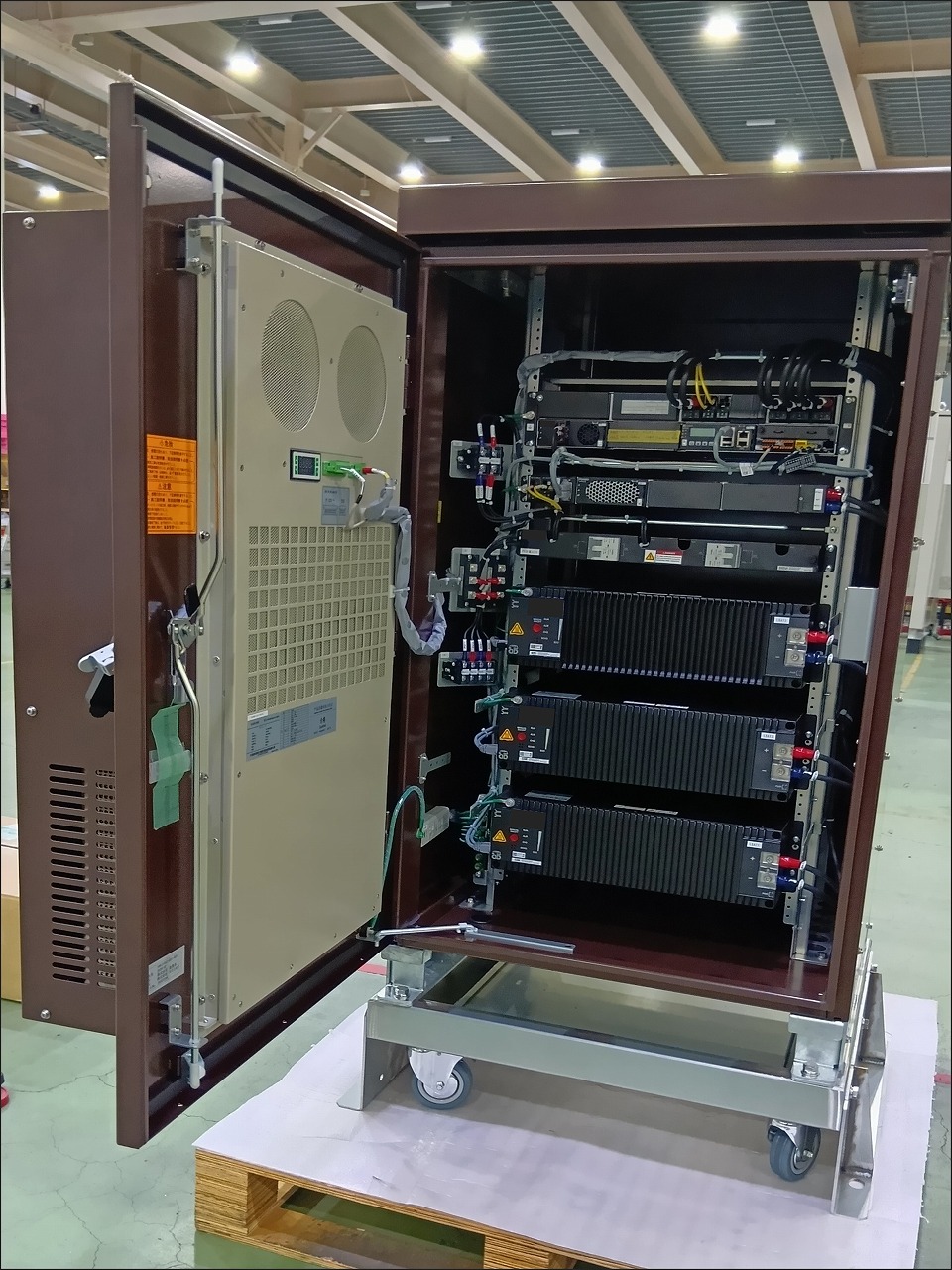 - 制御ユニット: 上部からPV分電ユニット、整流器、AC出力用インバータシャーシが配置されています。